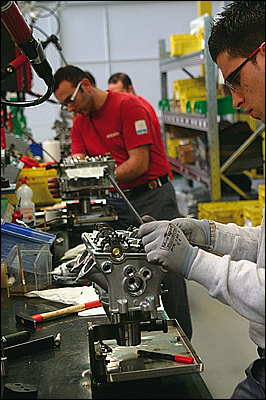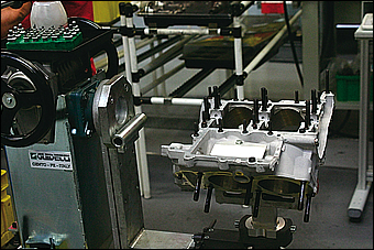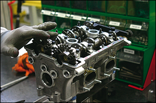 組立作業は6つの行程に分かれメインのライン上でエンジンを組み立てていくが、その脇に3つの専用作業テーブルがあり、それぞれピストン周り、ミッションなど腰下周り、そしてシリンダーヘッドを組み上げている。要は細かいパーツの集合体はそれぞれのセクションで先に組み上げてしまい、アッセンブリーでメインラインに供給するという仕組みだ。