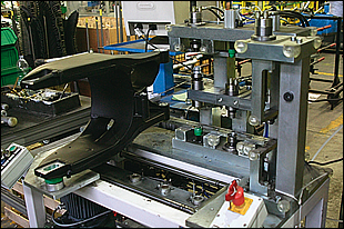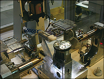 作業台1ではピストンとコンロッドを組み立てる。これはピンクリップを組み込む専用機械。 |