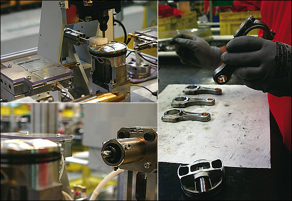 パーツを手作業で丁寧に組む様は、レーシングマシンのエンジン組み立てそのものだ。しかし、確実性を重視する部分は機械を導入。D16RRへのこだわりを感じさせる。