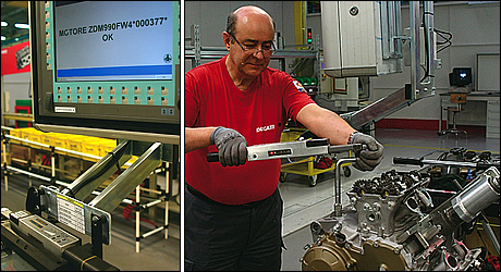 写真右はワイヤレストルクレンチ担当のおじさん。締め付け順序もトルク管理も、コンピューター管理で確実さを優先。精度の高い仕上がりを目指すからこそのシステムだ。 |