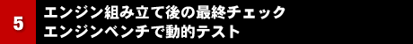トルクチェックが終了し組み上がったエンジンは、ラインの最終チェックゲートであるベンチテストにかけられる。通常ベンチテストはスパークプラグに火花を飛ばしてエンジンの自発的回転でチェックを入れるが、D16RR用テスターは大型モーターを使い外部から強制的にエンジンを回してチェック。計測機器に接続しエンジンオイルが自動的に充填された後、回転数を2500rpmで4分、4500rpmで2分間回して仕上がりを確認する。