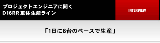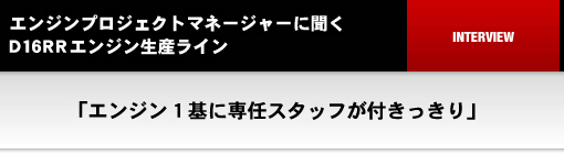 | D16RRのエンジン生産ラインは合計12人の専属スタッフで構成。フル稼働で1日8基ほど組み上げるシステムになっていたが、実際はペースを落として日産5基のペースに抑えていた。それは、D16RRが特別な車輌ゆえ生産初期の段階では余裕あるスケジュールを組み、確実な作業を目指していたためだ。