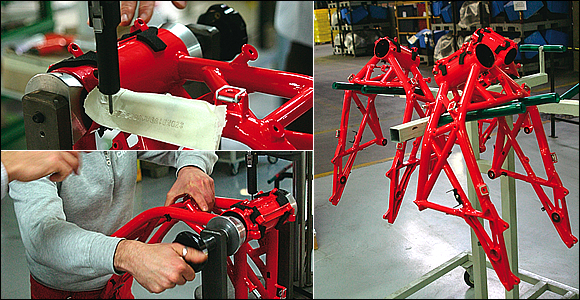 ハイブリッド・トレリスフレームを採用するD16RR。トレリスセクションは従来モデルより短く、これが軽量化の一助となっている。このメインフレーム部分は、エンジンと組み合わせる前にやるべき作業がある。フレームナンバーの刻印である。専用冶具にセットし台紙を挟んだ状態で、インプットしたアルファベットとローマ字を機械が正確に打ち込んでいく。これが、この車輌のアイデンティファイ・ナンバーになるのである。