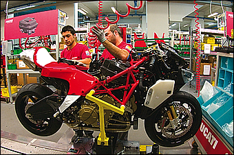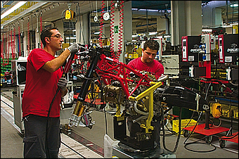 | 大量生産を基本とするマスプロダクト製品は、モーターサイクルに限らず生産ラインに於いてとことん効率を優先する。クルマの場合、機械が正確な作業を延々繰り返していくが、モーターサイクルの場合まだ人の手に負うところが大きい。基本となるパーツが右から左へコンベア上を流れ、各作業員が担当分のパーツを組み込み徐々にカタチにしていく。人は基本的に動かず同じ場所で同じ作業を繰り返し、目の前をいくつものエンジンや車体がゆっくりと流れて行くのが一般的な生産ラインの在り方だ。