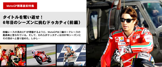 昨年の9月28日、ツインリンクもてぎで行われたMotoGP第15戦日本GP。シーズンを通して圧倒的な速さと安定感を発揮した宿敵フィアット・ヤマハとバレンティーノ・ロッシが、我々の目の前でドゥカティ・マールボロとケーシー・ストーナーのタイトルを奪い去った一戦…。あれから半年が過ぎ、来る4月12日に決勝レースが行われるカタールGPを皮切りに、いよいよドゥカティのMotoGP参戦6年目のシーズンが開幕しようとしている。果して、今シーズンのドゥカティはタイトルを奪還できるのか。今回の特集では、チャンピオンシップの行方を占う上で非常に重要な、ドゥカティ・チームのプレシーズンの活動を振り返ってみることにしよう。