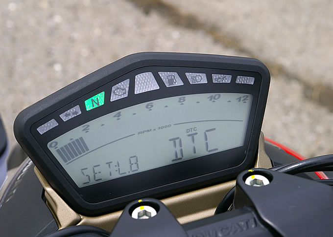 この秘密はDTC(ドゥカティ・トラクション・コントロール)にある。これはライダーのアクセル開度や路面状況などをコンピュータがセンサーで読み取り、駆動系に介入することでリアタイヤの空転を防ぐシステムだ。1098に搭載されていたものはあくまでレース用装備だったが、このモデルのDTCは公道での走行を前提として開発された最新版で、ライダーのレベルや走行場所に応じて調整が可能になっている。これが搭載されていることにより、恐怖感なくアクセルを開けていくことができるのだ。しかも介入のタイミングが絶妙で、自分の走りにあわせたレベルを設定すると、DTCの存在を感じることはほとんど無くなってしまうほど。見た目どおりの過激な走りを持ちながら、同時にライダーをむやみに萎縮させないジェントルな性格も持ち合わせたストリートファイターは、ただのパフォーマンスネイキッドではない。