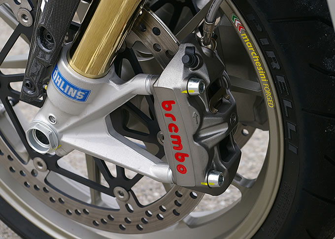 フロントはオーリンズ製フルアジャスタブルフォーク+ブレンボ製ラジアルマウントキャリパー。制動力は強烈だが、フィーリングに恐怖感は無い。