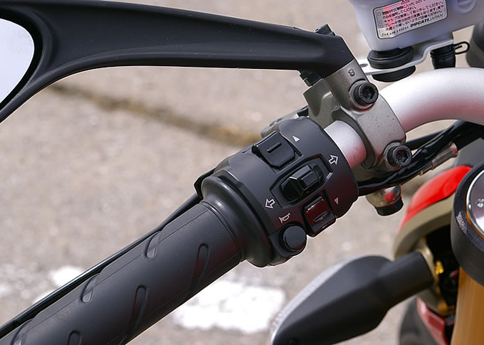 ここ最近のドゥカティでお馴染みとなった、ハンドルマウントのメーターコントローラー。1098より小型になり、操作し易くなっている。
