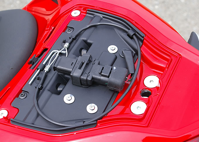 シートカウル内にはDDAを標準装備。ヘルメット固定用のワイヤーも付属している。ちなみに、車載工具はヘキサゴンレンチ1本のみ。