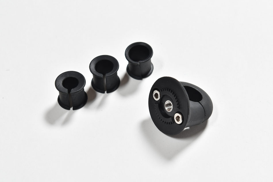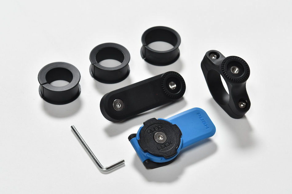 ハンドル径φ22mm/25mm/28mm/32mmに対応するマウント。ハンドル側ホルダーとスマホアタッチメント、延長ステー、取り付け用六角レンチが付属。ハンドル周囲の障害物を避けるためにステーを使って左のように縦に取り付けることも可能。