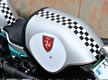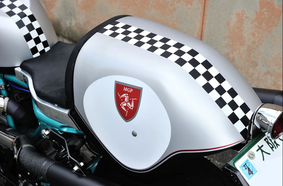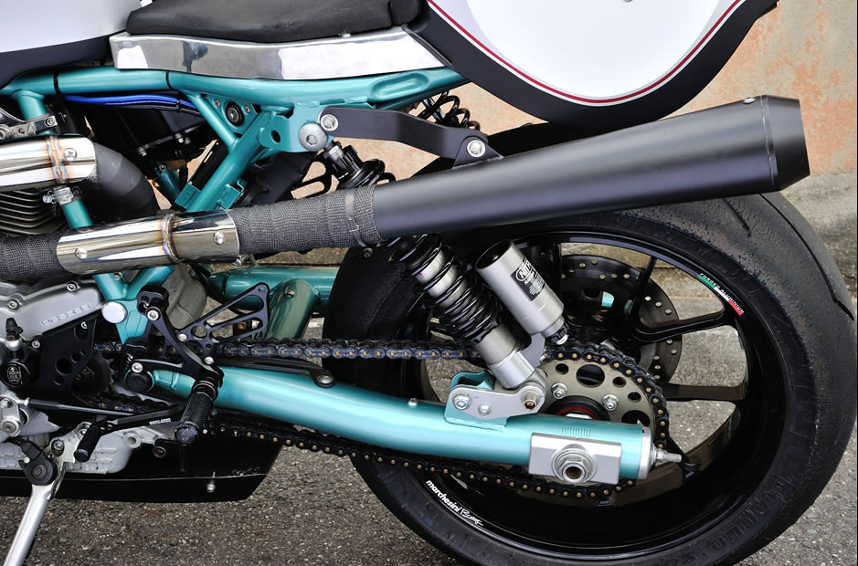 「シルバーがグレーっぽくならないか? ポールスマートのイメージが変わりすぎないか? いろいろと聞きましたよ」と、当時を振り返る。ほかにもマン島のシンボルマークである「トリスケル」や「DUCATI」のロゴもペイントで入れた。そして極め付きがスイングアームだ。じつは谷川さんのポールスマートはビンテージ感を増すために、2本サスを採用した GT1000 のスイングアームに換装しているのだが、桑山さんがそれをフレームと同色に塗り上げたのだ。「データはないので、見た目で色を作りました」と言うが、当然ながら違和感はまったくない。