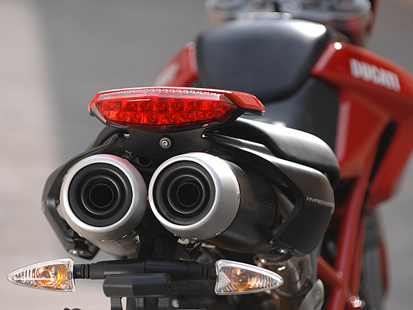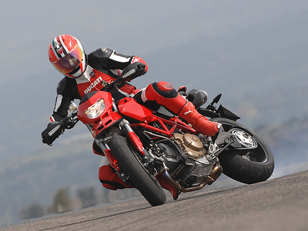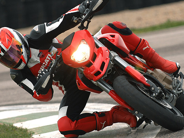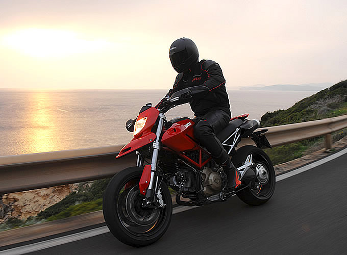 その成り立ちから言って、ハイパーモタードが本領を発揮するのは、ある程度速度が出るワインディング、特に、高速、中速コーナーの連続するエリアだ。コーナーへのアプローチは、着座位置がかなり前寄りのため、下半身でフロントタイヤを押しつぶしていくような独特のフィーリング。前輪荷重が増すため、コーナーリング中のハンドリングも極めてシャープだ。国産ネイキッドなどから乗り換えた場合、ハイパーモタードの鋭さにほとんどのライダーが驚くに違いない。エンジンそのものは扱いにくくはないのだが、その軽量な車体は右手の動きに敏感に反応し、スロットルを開ければドーンと飛び出す。これを制御するブレーキは制動力の立ち上がりが鋭く、軽く握りこめば指2本でロックさせることも可能。街中を普通に走っているだけでもこのクイックな操作感がライダーを飽きさせない。スーパースポーツに比べると、コントロールの仕方も分かりやすく反応もダイレクトなため、エキスパートでなくても、このマシンとの対話を楽しむことが出来るだろう。スーパーモタードのテイストを取り入れたまったく新しいスポーツモデルがハイパーモタードだと言える。