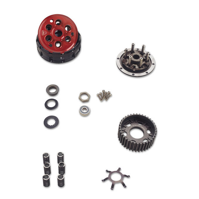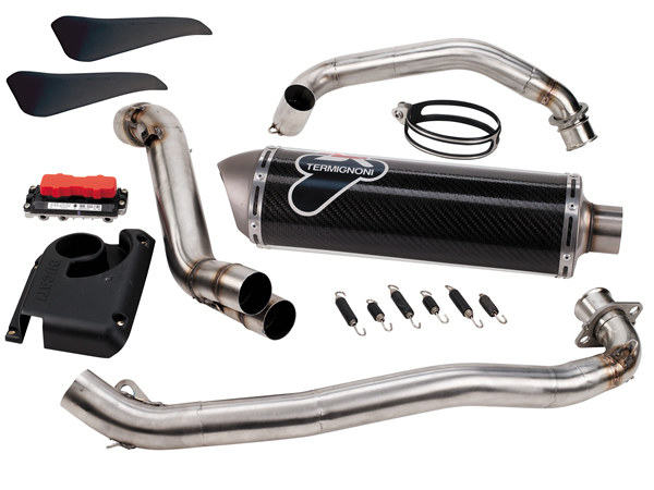 スポーツイメージの強いハイパーモタードだが、そのアップライトなポジションはツーリングもカバーする自由度の高いもの。そのため、意外かもしれないが、大容量のタンクバッグやシュラウドを覆うようにセットするセミハードタイプのツーリングバッグなどが設定されている。もちろん、レーシングスリッパークラッチやテルミニョーニ製マフラーなど、スポーツ走行をサポートするパーツ類も豊富に用意されている。