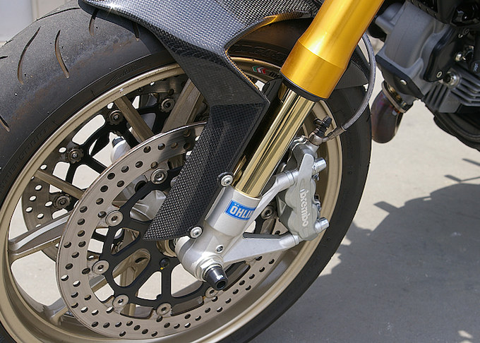 今回のモンスター1100シリーズの国内導入にあたっては、ベースモデルとなるモンスター1100の前に、ハイグレードモデルであるモンスター1100Sが先行した。エンジンスペックについては共通となるが、足回りが大きく異なっている。モンスター1100ではフロントにショーワ製43mmフルアジャスタブル倒立フォーク、リアにザックス製アジャスタブルモノショックとなっているが、モンスター1100Sではフロントにオーリンズ製TiNコート43mmフルアジャスタブル倒立フォーク、リアには同じくオーリンズのアジャスタブルモノショックを採用。その他では、フロントのディスクローターのインナーをアルミ素材としたほか、フェンダーなどにカーボンパーツを採用し、軽量なモンスター1100よりさらに1kgの減量に成功している。