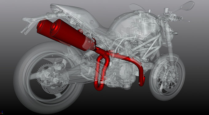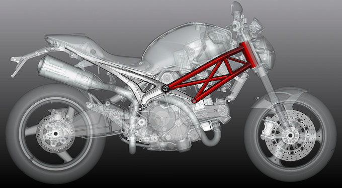 モンスター696に与えられた新型エンジンは、空冷4ストロークデスモドロミック2バルブで、ボア・ストロークも先代モデル同様だ。しかし、シリンダーヘッドやピストン、燃焼室形状などが全面的に見直され、出力は9%アップの80馬力へと強化。このモデルのキャラクターと騒音規制を考慮した湿式クラッチを採用するとともに、シフトダウン時のショックを緩和するAPTCクラッチなども標準装備とされるなど、一般的なエントリーモデルとは一線を画す豪華な設計となっている。また、ピッチを詰めることによりフィンの枚数も増やされた空冷エンジンは、冷却効率を高めるとともに独特の美しさにも磨きがかけられた。車体に目を移すと、フレーム形式は従来同様のクロモリ鋼管製トレリスフレームだが、部材は1098などと同サイズまで大径化され、サブフレーム部分もアルミ製とするなど、こちらは完全な新設計であることが分かる。また、足回りは高剛性を誇る43ミリ径インナーチューブのショーワ製フロントフォークとアジャスタブルリアスペンションの組み合わせ。ブレーキシステムは、フロントにラジアルマウントキャリパーを採用したブレンボ製とするなど、すべてにおいてワンクラス上のスペックが与えられている。