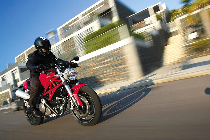 モンスター696は、161キログラムという軽量な車体に、80hp/9000rpmのパワーと69Nm/7750rpmのトルクを発生するパワーユニットを搭載しており、かなりビビッドなモデルだ。しかし、それだけがモンスター696の魅力ではない。エンジンはミドルクラスとしてはかなり元気だが、そのフィーリングに荒々しさはなく、むしろ上手く調教されているという印象が強い。そのため、2気筒らしいトラクションを味わっているうちに、相当なスピードまで達してしまうこともしばしば。足回りを固める43mm径のインナーチューブを持つショーワ製倒立フォークと、リンクレスで搭載されたザックス製リアモノショックも、必要にして十分な性能を有していながら、街中やワインディングなど、あらゆるステージでモンスター696のコントロール性を高めるセッティングが施されている。さらに、あえてラジアルタイプではなく一般的な形式のマスターシリンダーを採用したブレーキシステムは、握り込む力に応じてジワっと制動力が立ち上がる設定。誰でも路面のグリップと相談しながらのブレーキングが可能なセッティングとなっているのだ。良好なパワーウェイトレシオがもたらす加速感を、誰でも味わえるように構成したトータルバランス。これこそがモンスター696最大の魅力である。