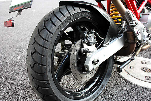 片持ち式を採用するムルティストラーダ1000DSに対し、一般的な形状のスイングアームを採用。タイヤも160/60-17と細めの設定となっている。