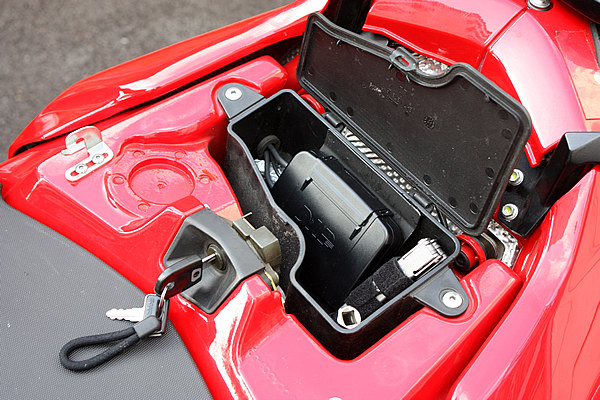 シート下にはフタ付きの小物入れを備えている。ETC機器やちょっとした工具類を収納可能。その代わり1000DSにあるフロントカウルの収納は620には未採用。