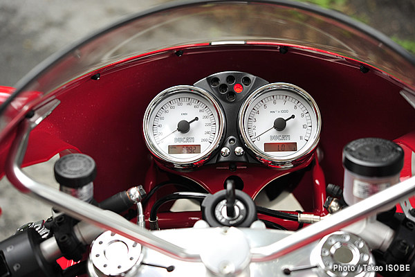 基本諸元はGT1000と同じだが、リアサスペンションがフルアジャスタブルタイプに変更されているのが特徴。低く構えたセパレートハンドルはかなりレーシーなポジションとなっており、スーパーバイク1198と比べても低く感じるほどだ。