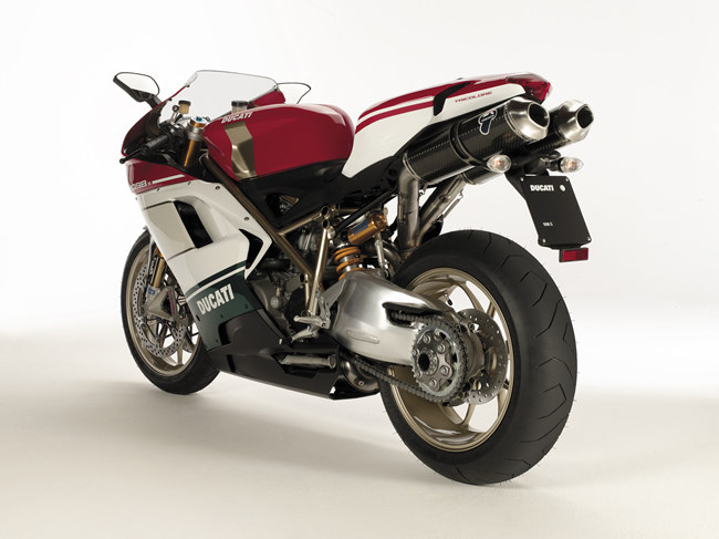 美しいカラーリングの1098Sトリコローレ。1098Sとの間に諸元や仕様の違いはないが、同梱されるテルミニョーニ製102dBマフラーキットやEUCを装着した状態では公道走行不可となる。価格は299万9000円。