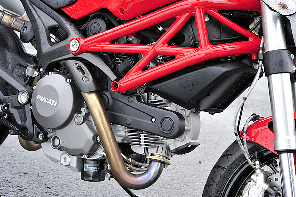 ハイパーモタードにも搭載される『デスモデュエ』だが、モンスター796のほうがパワーがアップを図られている。そのパワーをサポートするためオイルクーラーを装備する(M696にはオイルクーラーはない)。クラッチは湿式で、APTCスリッパークラッチを内蔵。