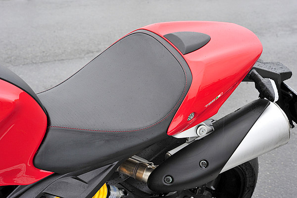 それともう一点、796には新しく開発されたシートが装備される。表地がツートーンになり見た目に美しいステッチも特徴だが、座面が水平になったことで落ち着いたライディングをもたらすのである。