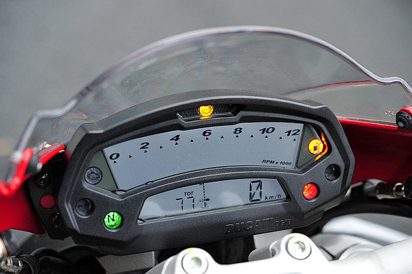 メーターパネルはデジタル液晶式。機能、デザインともに696や1100と同じだが、バックライトは白色で、これは1100と同じ仕様だ(696はオレンジ色)。