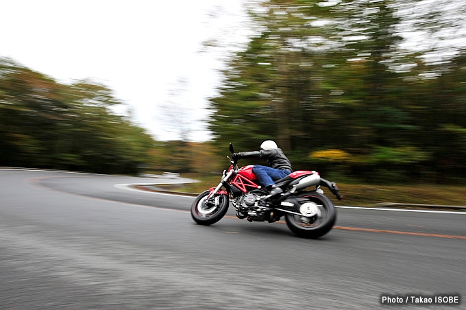 こうして見てくると、モンスター796が先に登場した696と1100の長所をうまく採り入れており、いいとこどりの性格を持っていることがよくわかるだろう。では、実際の乗り味はどうなのかというと、やはりいいとこどりなのだ。ボアは696と同じ88mmだがストロークが延長された空冷Lツインは、696の空冷Lツインが小気味よく回る高回転型なのに対して、796の心臓であるデスモデュエは低~中回転域からより豊かなトルクを発生する。ドゥカティらしい素早い回転上昇も持ち合わせているが、796のエンジンにはまろやかさが加わっている。そこにあるのは“ゆとり”だ。エンジン特性によるところもあるが、ハンドルバーマウントが20mm高くなったことによってライディングポジションに余裕が生まれていることも、796のみが醸し出すゆとりの要因だろう。