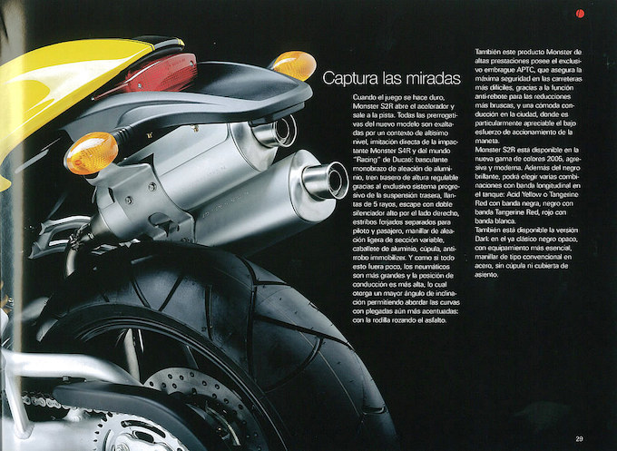 モンスターS2Rは、扱いやすい性格と人気のスタイルによって爆発的にヒットします。装備内容を考えるとかなりお買い得だった 105万円(税込み)という価格も販売好調の理由でした。空冷ならではの軽く小さな車体と、軽量なプラスチックのガソリンタンクや操作の軽い APTCクラッチは、女性や初心者を中心とした“はじめてのドゥカティ”というユーザーから多くの支持を集めます。しかしそれだけではなく、“気軽に乗れるわりに高性能”と、スーパーバイクシリーズを所有する上級者がセカンドバイクとして購入するケースも多くありました。そのため、イメージカラーのイエローをはじめ、常に新車が品薄状態でした。このモンスターS2Rのヒットは、2012年の現行モデルにも続くミドルクラス人気のきっかけになっています。