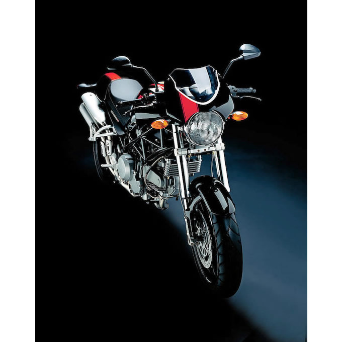モンスターS2Rは、2005年から 2007年まで販売されました。モンスターS4R が先鞭をつけた片持ちスイングアーム、左2本出しマフラー、マルケジーニ製の5本スポークホイールを採用したスタイルが最大の特徴です。エンジンは、先代モデルの モンスター800S などで扱いやすさに定評のあった803ccの空冷2バルブ&湿式クラッチを引き続き搭載。加えて、APTCクラッチ(アドラー製のスリッパークラッチ)を装備することでエンジンブレーキを緩和すると同時にクラッチ操作の重さも軽減し、これらドゥカティの弱点を克服することに成功しています。このようにモンスターS2Rは、ますますユーザーフレンドリーになった性能と、次世代のアグレッシブなスタイルを兼ね備えた“いいとこ取り”のモデルでした。また 2006年にはこの方向性を同じくするモンスターS2R1000も登場しています。このとき、区別のために車名がモンスターS2R800になりましたが、内容に変更はありません。