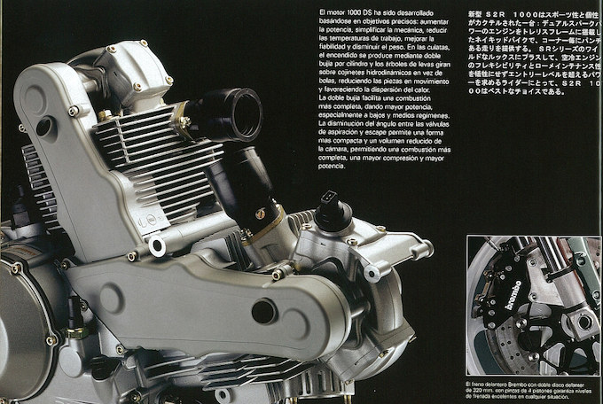 モンスターS2R1000は、2006年に登場しました。モンスター 900 シリーズ、1000 シリーズと発展してきた空冷モンスターに、水冷のモンスター S4R & S4RSテスタストレッタ と同様の片持ちスイングアームや左2本出しマフラー、マルケジーニ製ホイール、プラスチック製のガソリンタンクを追加した空冷のハイエンドモデルです。空冷系では 2005年に、弟分である モンスターS2R(800) がこれとまったく同じパッケージで先行デビューしていましたが、フロントブレーキが片押し2ポッドキャリパー+小径ディスクとされるなど、あくまでもコストダウンが図られたミドルクラスモデルにすぎません。一方、このモンスターS2R1000は、デュアルスパークと呼ばれる排気量992ccのツインプラグエンジンに伝統の乾式クラッチを組み合わせ、フルアジャスタブルのフロントサスペンションやリザーバータンク別体のフロントブレーキマスターも装備した、まさに “空冷モンスターのフラッグシップ” でした。