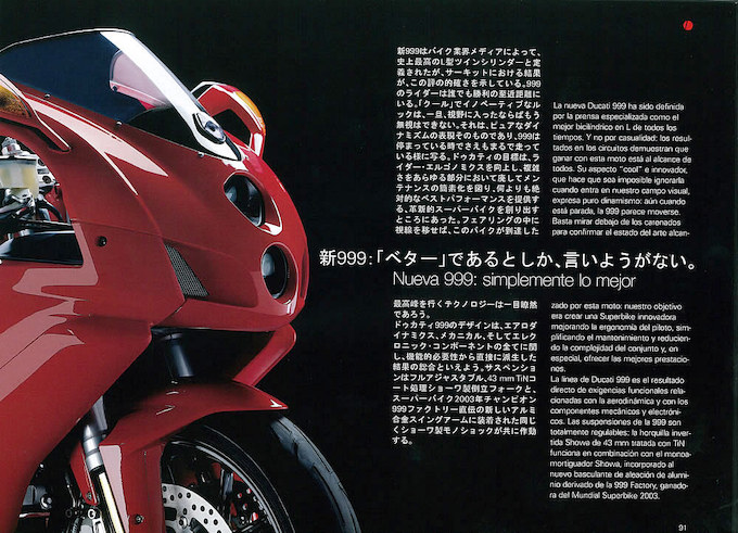 999 シリーズは、2003年~ 2006年に生産・販売されたスーパーバイクのフラッグシップです。縦に並んだ斬新なデザインのヘッドライトや位置調整のできるステップ、シートカウル、ガソリンタンクなど、当時のドゥカティの最新技術と設計思想が詰まっていました。その技術の代表例が 996R ・ 998 と段階を踏んで搭載してきたバルブ挟み角の狭い排気量998ccのテスタストレッタエンジンです。軽量コンパクトヘッドの高回転型水冷エンジンは「スタンダード」、前後オーリンズサスペンション装備の豪華仕様「S」、スーパーバイク世界選手権のベースモデル「R」といったグレード展開とともに、現行モデルに引き継がれています。