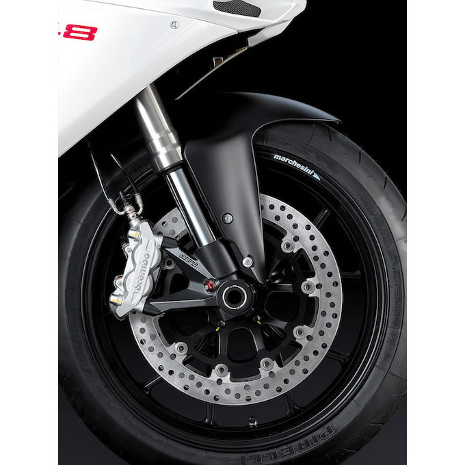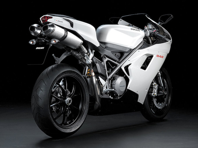 2013年の現行ラインナップに並ぶ 848 EVO の一世代前にあたる 848 は、2009年に登場しました。外観や車体の大部分をフラッグシップの 1098 シリーズと共用しつつも、排気量 849.4ccの 848 テスタストレッタ・エボルツィオーネエンジン を搭載している点が、848 の大きな特徴となっています。スーパースポーツ世界選手権をはじめとした市販ミドルクラスレースの750ccという排気量基準にとらわれずに、あくまでも公道でのスポーツライディングを楽しむことを目的としたモデルです。そのため、レースに対応する上位モデルは設定されず、スタンダードモデルのみがラインナップされました。逆に、オーリンズ製の前後サスペンションやフロントフォークの TiO コーティング、モノブロックフロントブレーキキャリパー、トラクションコントロールシステムといった過度な装備を省くことによって、車両価格が抑えられています。しかしながら、前後にはフルアジャスタブルサスペンションを備えており、その走行性能は必要にして十分です。