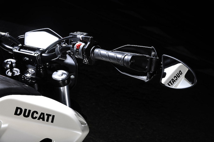 ハイパーモタード1100S が強力で手強く、乗れる人を限定してしまっていたこともあり、ハイパーモタード796 は、“気軽に乗れてどこにでも行ける” モデルとして人気を集めます。大きさや性能、新車価格が全体的にちょうど良く、老若男女を問わず初めてのドゥカティに選ばれることが多かったですね。リンク式のリアサスペンションが採用されていることで、リンクロッド を交換するだけでローダウンできるのも人気の理由です。スタイルが好きで乗るユーザーが多いのも特徴で、見た目を大きく変えるようなカスタムはされず、純正オプションを使ってハンドルバーエンドのバックミラーを通常の位置に戻したり、フレームスライダーを装着したりといった小変更がほとんどでした。