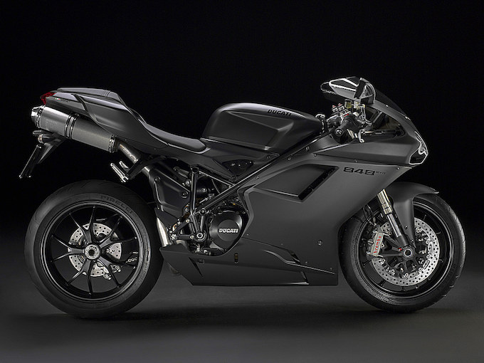 2009年に登場した 848 シリーズ は、2010年に 848 ブラック というモデルを追加設定しました。これは外装をマットブラックとすることで価格を抑えた廉価仕様ではあったものの、排気量 849.4ccのテスタストレッタ・エボルツィオーネエンジンをはじめ、サスペンションやスイングアームなどの足まわり、その他の装備は、スタンダードの 848 とまったく同じものでした。このブラックモデルは、2011年に 848 シリーズが燃焼室やピストンの形状を変更した改良型エンジン&モノブロックブレーキキャリパー採用の 848 EVO へと進化するときにも設定されます。それが今回紹介する 848 EVO ブラックです。もちろん、新型エンジンやブレーキまわりは、スタンダードモデルと同一でした。
