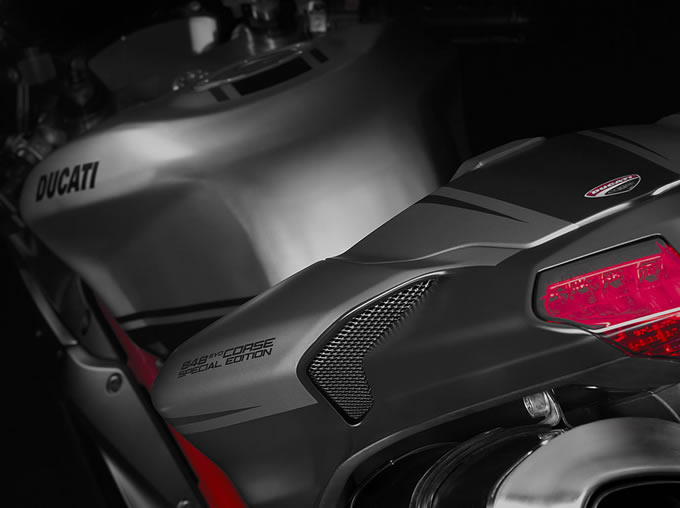 848 EVO コルセスペシャルエディションは、デビューと同時に人気を集めました。DTC&DQS の電子制御デバイスやオーリンズ製のリアサスペンションが魅力的だったのはもちろんですが、それだけの装備が付いているにも関わらず、なぜか 2012年モデルの新車価格が 848 EVO と同額だったからです。2013年モデルでは 18 リットルの大容量アルミ燃料タンクが追加され、価格が4万円(税込み)上昇したものの、お買い得感が高いことに変わりはなく、 848 EVO コルセスペシャルエディションは販売台数を伸ばしました。