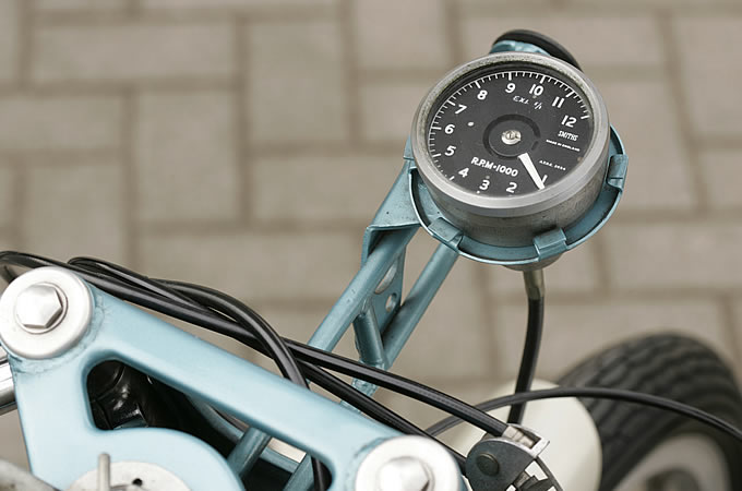 12000rpmまで目盛りが刻まれているスミス製グランプリメーター。多くのレーサーに装着されていた精度の高い逸品。マグネットタイプ。