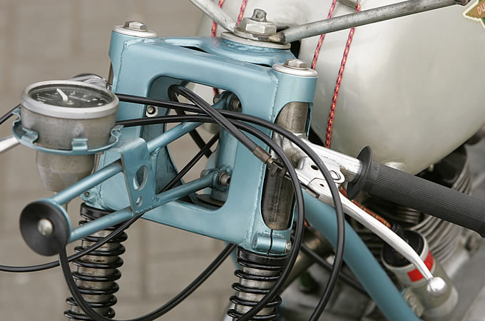 シリンダーからは下はそのままで、ヘッドだけを取り替えてバージョンアップをさせるのがタリオーニお得意の技。それにより、出力はマリアンナの12psから30%アップの15.5ps/10500rpmとなり、この1958年型ではさらに17ps/12500rpmまで上げられた。ちなみにデスモヘッドは18ps/12500rpmで、数字だけではあまり差が無いように見えた。