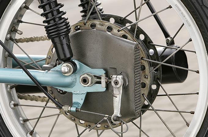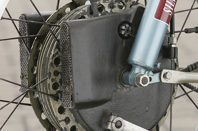 前輪まですっぽりと覆い隠していたダストピンカウル時代の名残を残すフォークブラケット。プレス成型されたスチールパネルによるボックス構造で、上下のブラケットを一体化して強度を保っている。