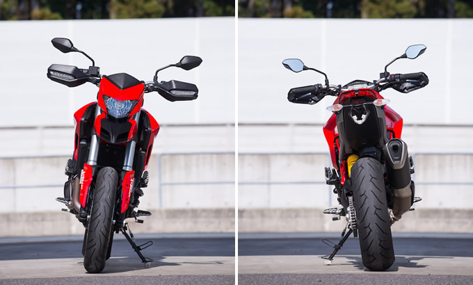 近年では異なる道を進んでいるものの、2007年にデビューしたハイパーモタードは、もともとは初代ムルティストラーダの基本設計を転用して生まれたモデルだった。2003年から発売が始まったムルティストラーダの特徴は当時、ドゥカティらしからぬとも言われた“アップライトな乗車姿勢+ストロークの長い前後サスペンション”で、ムルティストラーダがその特徴をツーリング性能に活かしたのに対して、ハイパーモタードはスポーツ性を重視して開発。もっとも、両車の思想と構造に共通点が感じられたのは2009年型までで、ロングランでの快適性を重視するムルティストラーダは2010年から、軽さと親しみやすさを追求するハイパーモタードは2013年から、それぞれの分野に最適化した専用設計のエンジンとシャシーを採用している。