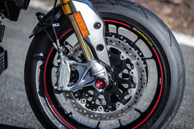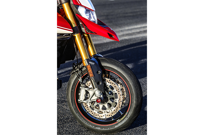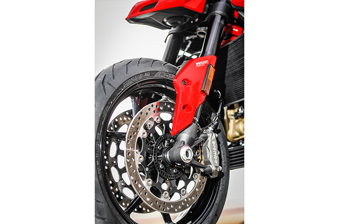 ブレーキキャリパーは両モデルとも定番のブレンボ・ラジアル・モノブロックタイプを採用。ボッシュ製6軸慣性測定ユニットにより、コーナーリングABS機能を装備。設定によりモタードの代名詞でもあるブレーキングドリフトをサポートしてくれるスライド・バイ・ブレーキ機能も選択可能。