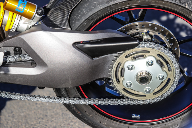 アルミニウム製片持ちスイングアームを装備。リヤサスペンションはSTDのザックス製に対し、SPはオーリンズ。ストローク量はSTD比プラス25㎜となる175㎜。