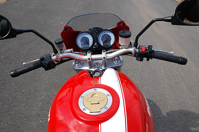 「モンスターシリーズはドゥカティの中でもコンパクトなだけあって、日本では女性に人気が高いという。確かに小柄な僕がまたがっても無理ないシート高で、両足のつま先をギリギリ地面に付けることができるし、片足と割り切れば余裕も出てくる。さらにバーハンドルによるアップライトなポジションが、ドゥカティのどこかスパルタンなバイクという気負いを打ち消してくれるのがイイ。キーを捻るとインジェクションによって高度に管理されたエンジンが一発で目覚め、自動的にアイドルアップしながらアイドリングする。クラッチはドカ乗りがみんな嫌がる重さだが、それも慣れれば気になるほどではない。シュコッと節度あるシフトフィールのギアを入れて走り出すと、これまでのドゥカティのイメージとは違うエンジンフィールが伝わってきた。というのも、極めて個人的な印象なのだが、ドゥカティのエンジンフィールは波形に例えると角のある感じだった。しかしS2R1000のDS空冷エンジンは、角のない滑らかなパルスという印象だったのである。