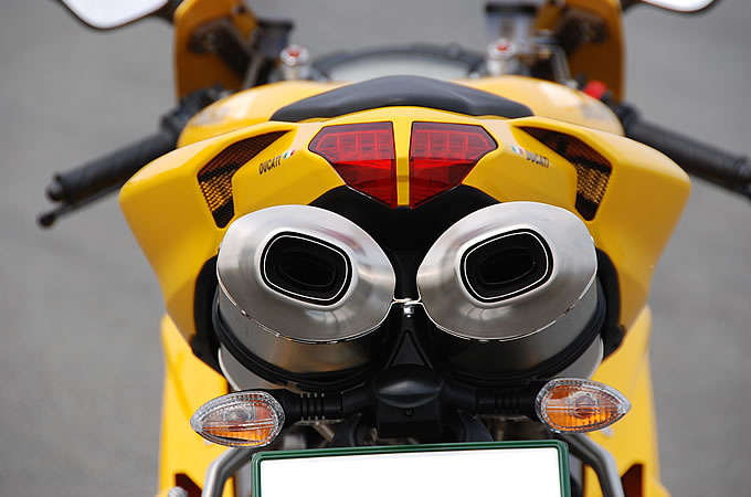 2003年に前作999がデビューしたとき、プロジェクターランプ2灯を縦に配置したレイアウトが、まるで『銀河鉄道999』に出てきた機関車のノーズにも思えるほど個性的だった。1098ではオーソドックスな横2灯のレイアウトになり、サイドパネルにあったスポイラーもなくなった。箱形だったサイレンサーも楕円断面の2本出しとなり、全体としてとてもコンベンショナルなのが1098のデザインだ。一方、スイングアームは916/996/998シリーズのように再び片持ちとなっているのが特徴。右側面からは細身のY字型5本スポークのホイールが丸々見える。プロジェクターランプを使ったデュアルヘッドライト、楕円断面2本出しマフラー、片持ちスイングアームなど、字面だけを追えばそのまま916/996/998シリーズ。イメージとしては998まで先祖がえりしたレイアウトを、現代風にアレンジしたのが1098と思えてならない。