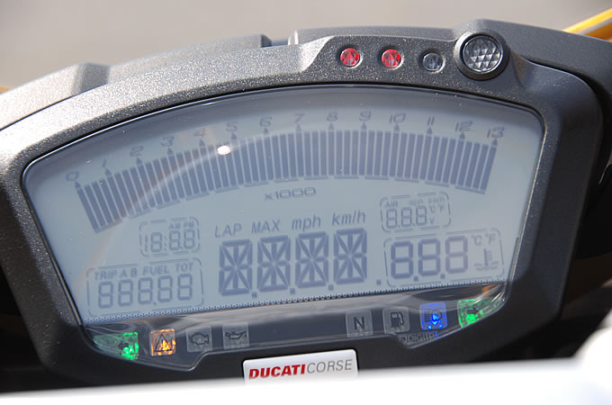 1099ccにスープアップされたエンジンは「テスタストレッタエボリューション」と呼ばれ、サイズアップにも関わらずヘッド周りはさらにコンパクトに進化。エンジン全体で5kg近い軽量化を実現している。エンジンは各部の見直しで999から20HP近い出力向上を実現し157HPをたたき出す。このパワーを受け止めるのがドゥカティ伝統の鋼管トレリスフレーム。日本製のスーパーバイククラスのバイクが、すべてアルミフレームなのに対して、ドゥカティはmotoGPマシンも含めて頑なに鉄パイプフレームを使い続けている。1098ではさらにこれが太くなり、カウルの隙間から覗く赤い骨格が存在感をアピールしてくるのだ。また、このIT化が進んだ時代に登場したドゥカティならではの装備にも注目したい。「DDA=ドゥカティ・データ・アナライザ」と呼ばれ、motoGPなどレースマシンに搭載されるデータロガー(記録)機能を1098Sでは標準装備(1098はオプション設定)する。これは水温、速度、エンジン回転数、ギアポジション、スロットル開度、ラップタイムといったデータを、専用のUSBメモリに記録し、パソコンの専用ソフト上でグラフ化して見ることができるというもの。1098ではバイクを移動するための道具から、スポーツライディングで楽しむ道具と捉え、オモチャ的な機能を付加した新しい試みだといえる。ワインディングを走った後、仲間とこのグラフを見ながら「アクセルの開けが足りないよ」と「回転数が高すぎるんじゃない」とワイワイやる話題の中心になりそうだ。