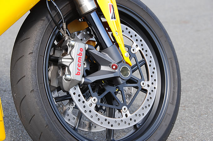 ラジアルマウントされる鋳造モノブロックのブレンボキャリパーと330mmディスクの組み合わせで、抜群の効きを示すフロントブレーキ。インナーチューブの酸化チタン処理と相まって強いアピアランスを与える。