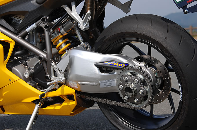 916/996/998の特徴のひとつだった片持ち式スイングアームが復活した。998以前の鋳造からアルミプレスのボックスタイプに進化している。高剛性の極太ゆえに、チェーンがスイングアームを貫通する。