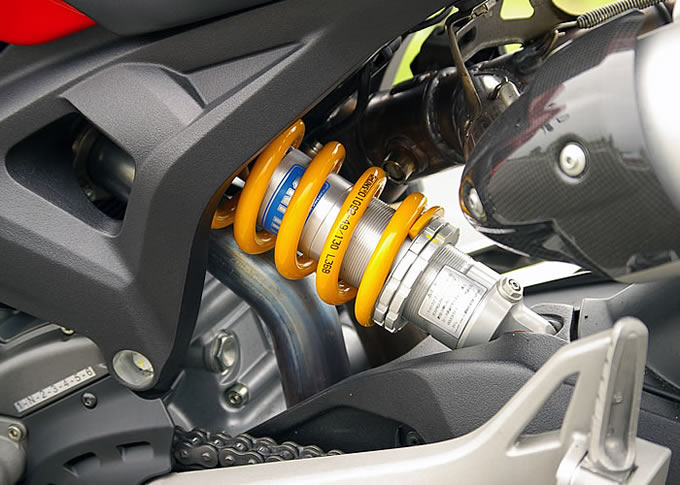 リア側にもオーリンズ製サスペンションを装備。標準の状態で街乗りを前提としており、初期の動きもスムーズだ。