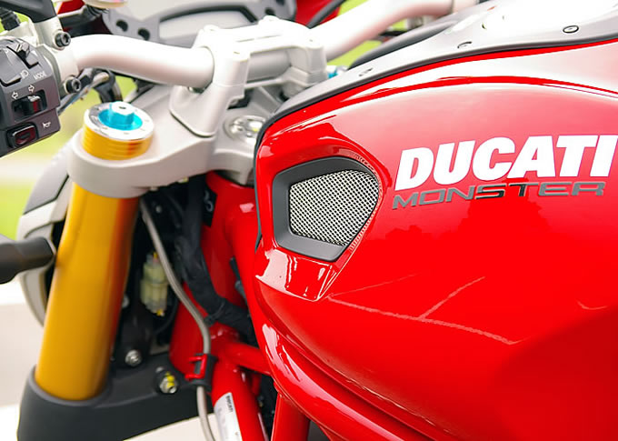 そして何より注目したいのは、モンスターならではのスタイリッシュなデザインだ。無骨なマシンが多勢を占めていたネイキッドカテゴリに革命をもたらしたモデルだけに、今回のスタイルもイタリアンデザインならではの美しさに満ちている。エアインレットとハンドルの逃げをタンクデザインに取り込んだ点など、ドゥカティならではの機能美と言えるだろう。シートからテールへと流れるラインや、無駄を排したハンドルまわりなど、独自の美学に基づくスタイリングは、ルックスとオリジナリティを兼ね備える仕上がりだ。それでいて、今まで築き上げてきたモンスターシリーズの後継であることを意識させるエクステリアは、見事という他はない。今購入できる他メーカーのネイキッドバイクと比較しても、モンスターは一際魅力的なモデルだ。