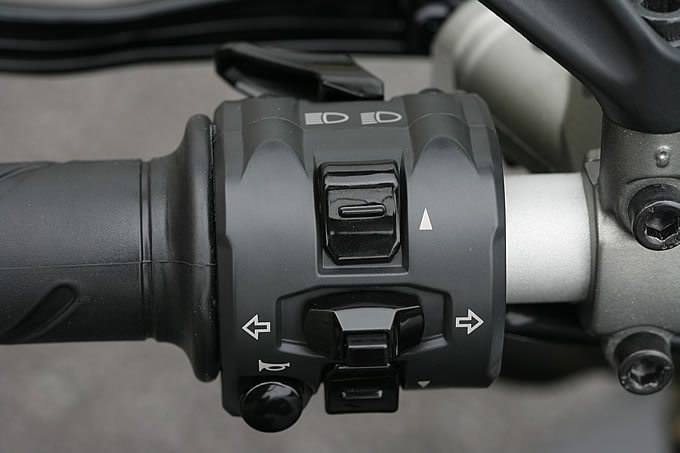 左側ハンドルスイッチにはパッシング&ハイビーム、ウィンカー、ホーン、ふたつのメーター操作スイッチが配される。各スイッチの配置はバランスがよく、またクリック感も確かなもので操作性は良好。